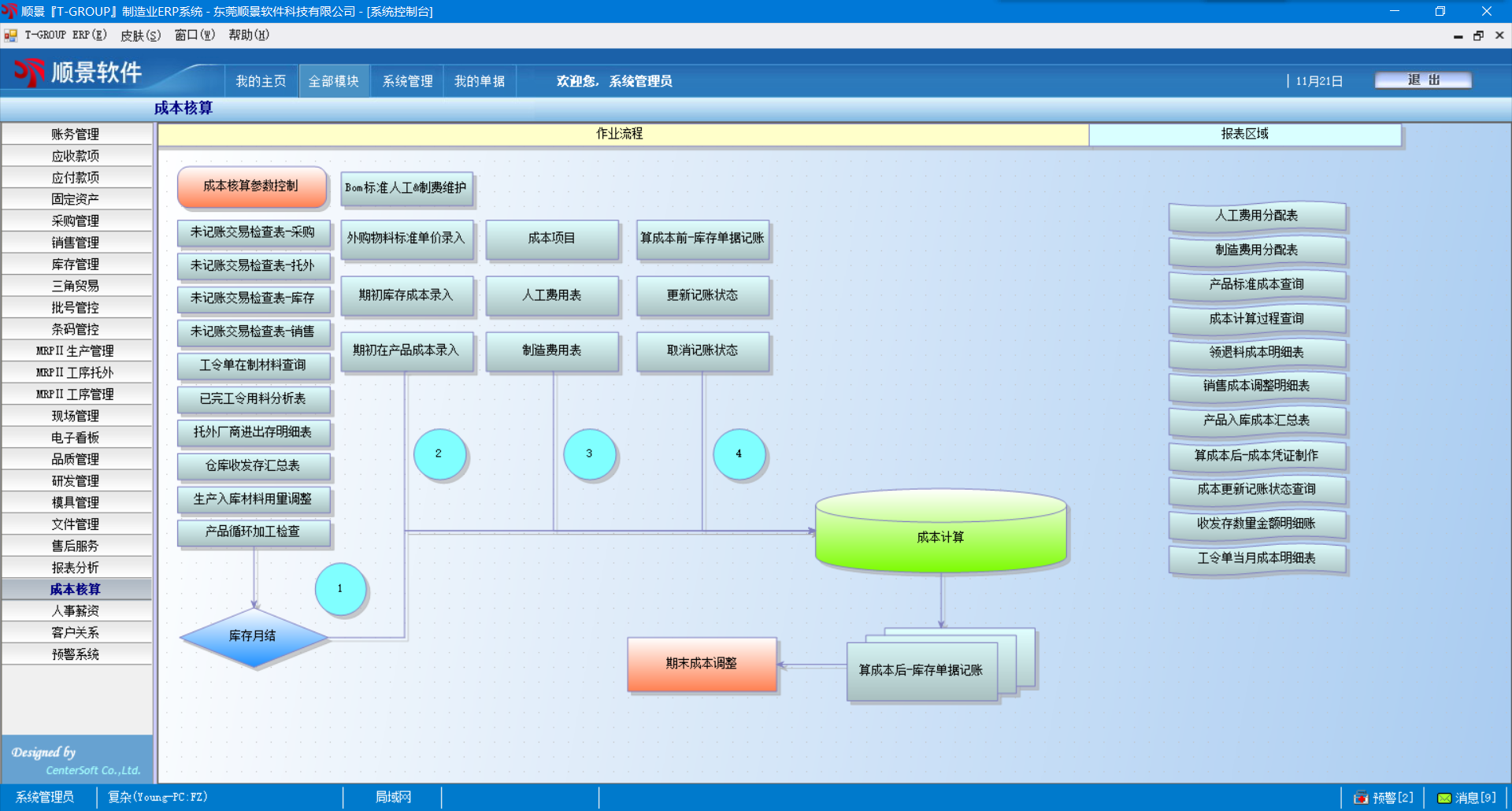 1.    每月在前部单据稽核完成后,点击一下“计算成本”按钮,所有成本计算工作皆由系统自动完成;